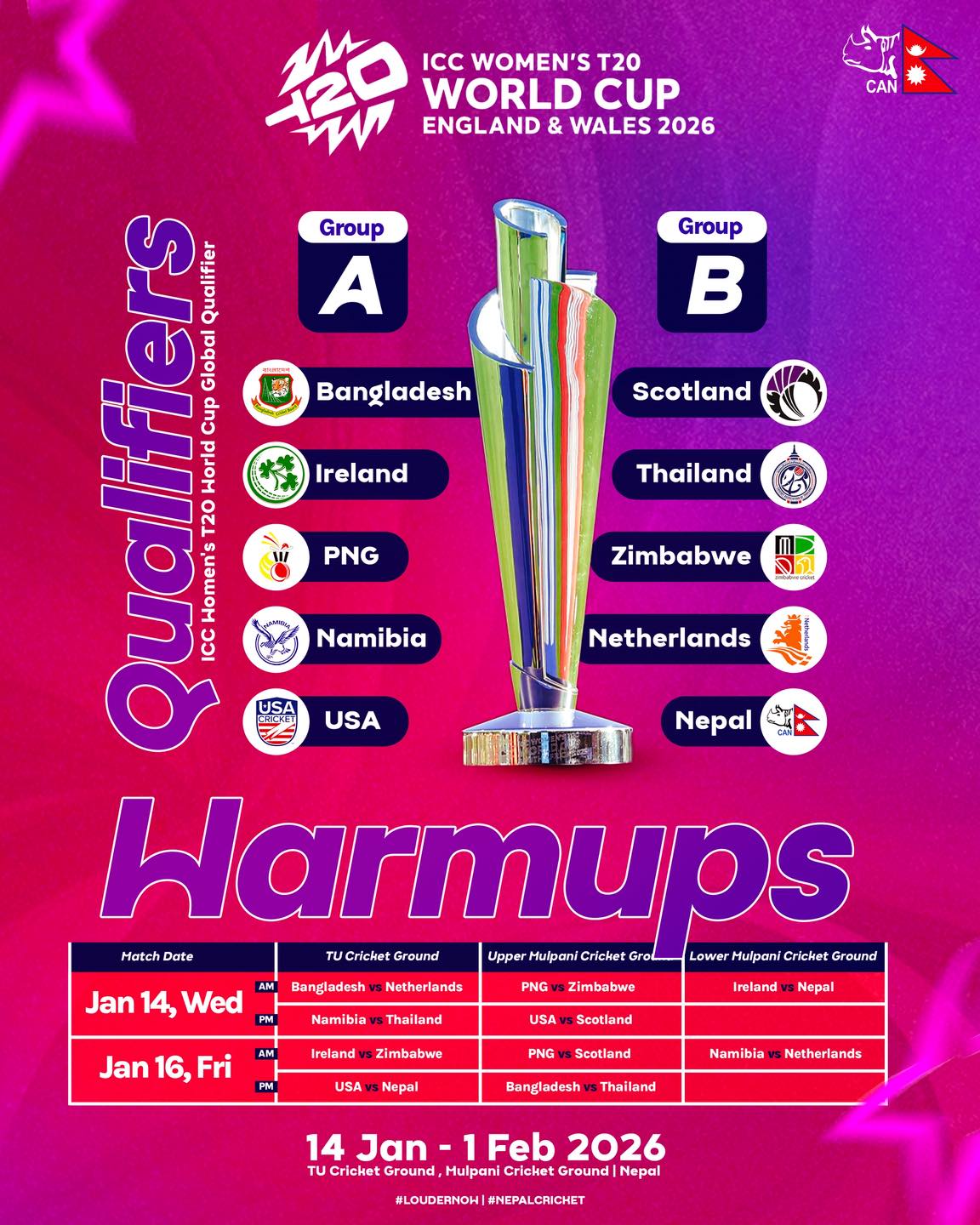 घरेलु मैदानमा हुने आईसीसी महिला टी-२० विश्वकप ग्लोबल छनोटको तालिका सार्वजनिक भएको छ, जहाँ नेपालले विश्वका शक्तिशाली टोलीहरूसँग विश्वकप प्रवेशका लागि प्रतिस्पर्धा गर्नेछ।