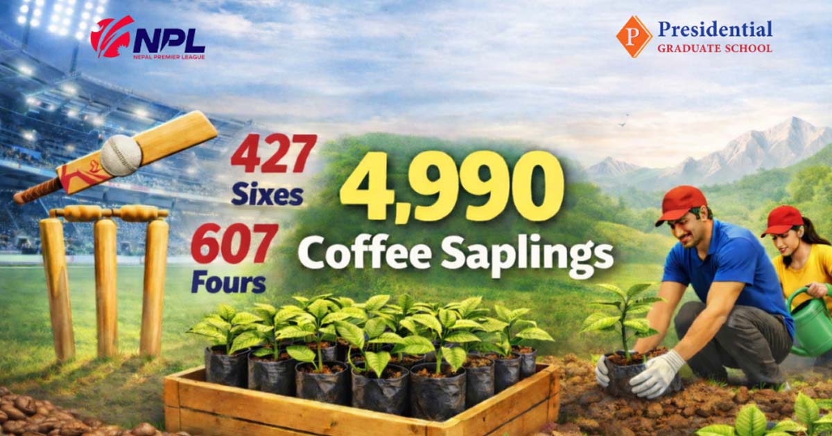 काठमाडौँ :नेपाल प्रिमियर लिग (एनपिएल) सिजन २ को एजुकेसन पार्टनर प्रेसिडेन्सियल ग्राजुएट स्कुलले प्रतियोगितामा बनेका रनबराबर कफीका बिरुवा रोप्ने घोषणा गरेको छ।
